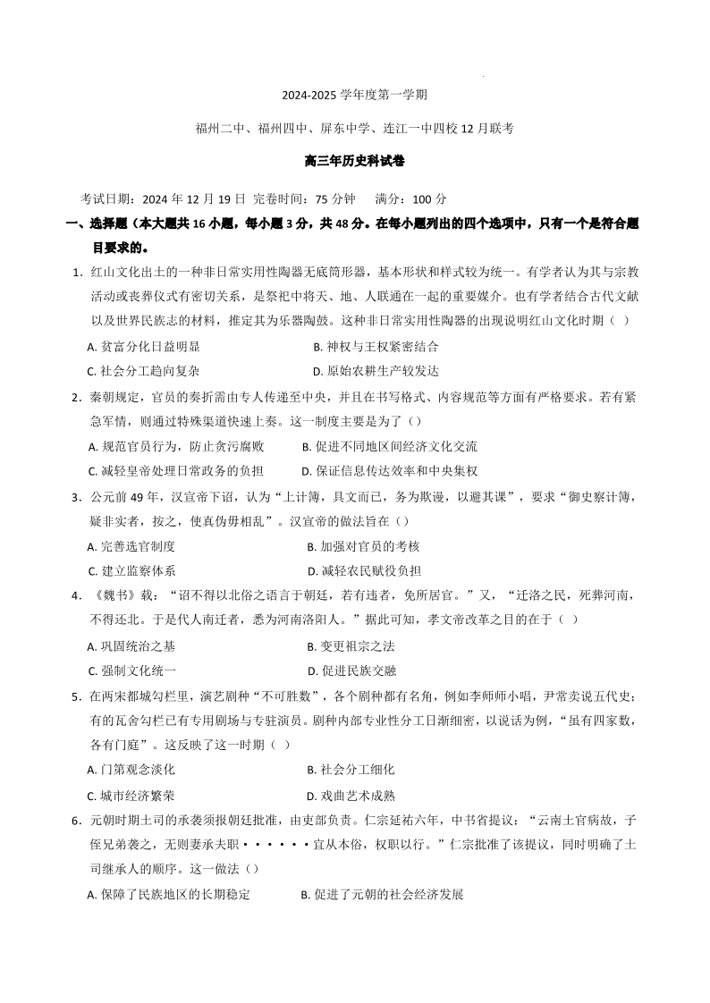 福建省福州二中、福州四中、屏东中学、连江一中四校2025届高三12月联考 历史.pdf