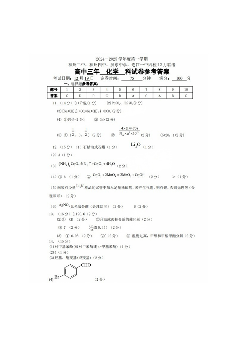 福建省福州二中、福州四中、屏东中学、连江一中四校2025届高三12月联考 化学答案.pdf