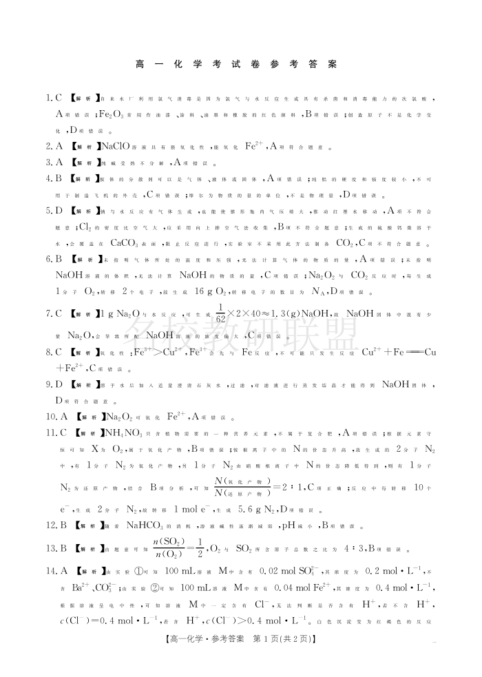 云南省昆明市五华区2024-2025学年高一上学期12月月考 化学答案.pdf