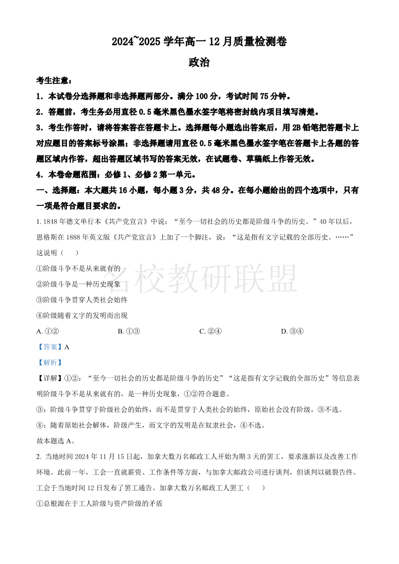 山西省三晋卓越联盟2024-2025学年高一上学期12月月考 政治答案.pdf