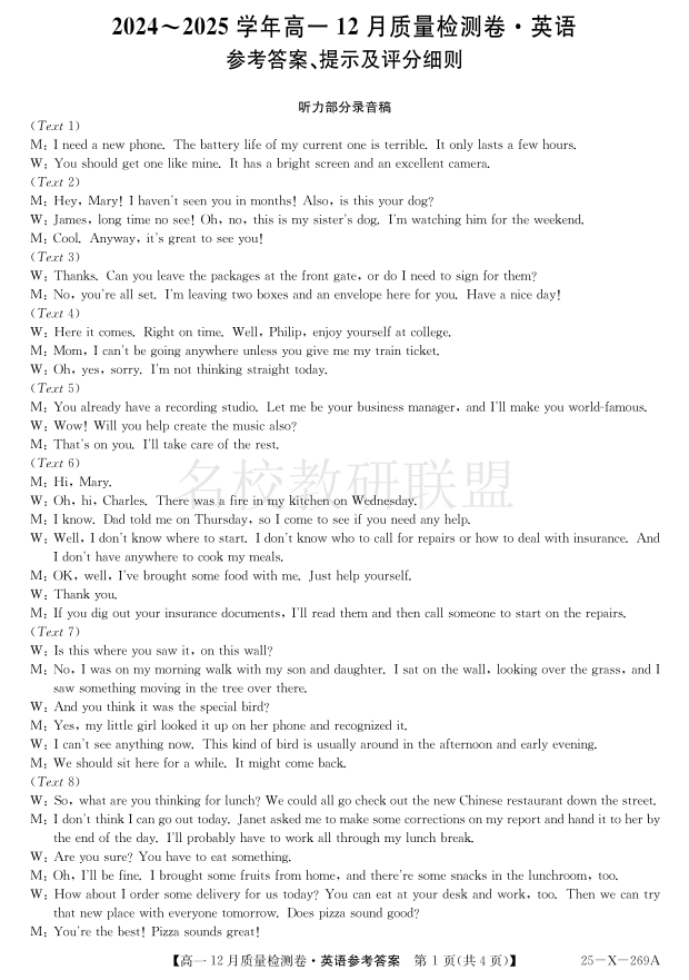 山西省三晋卓越联盟2024-2025学年高一上学期12月月考 英语答案.pdf