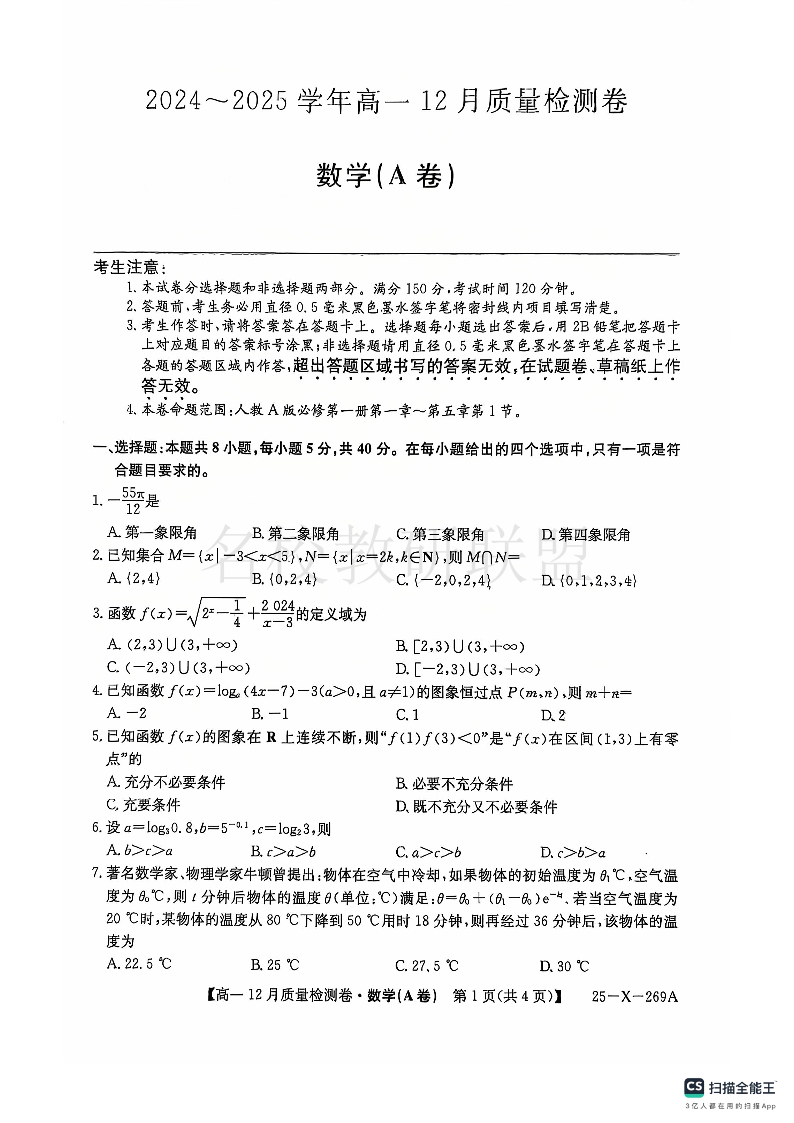 山西省三晋卓越联盟2024-2025学年高一上学期12月月考 数学.pdf