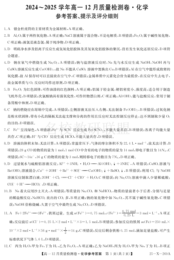 山西省三晋卓越联盟2024-2025学年高一上学期12月月考 化学答案.pdf