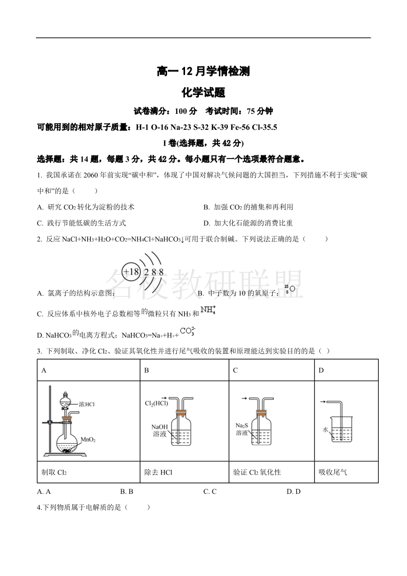 江苏省扬州市八校2024-2025学年高一上学期12月学情检测 化学.pdf
