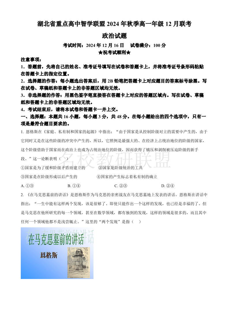 湖北省重点高中智学联盟2024年秋季高一年级12月联考 政治.pdf
