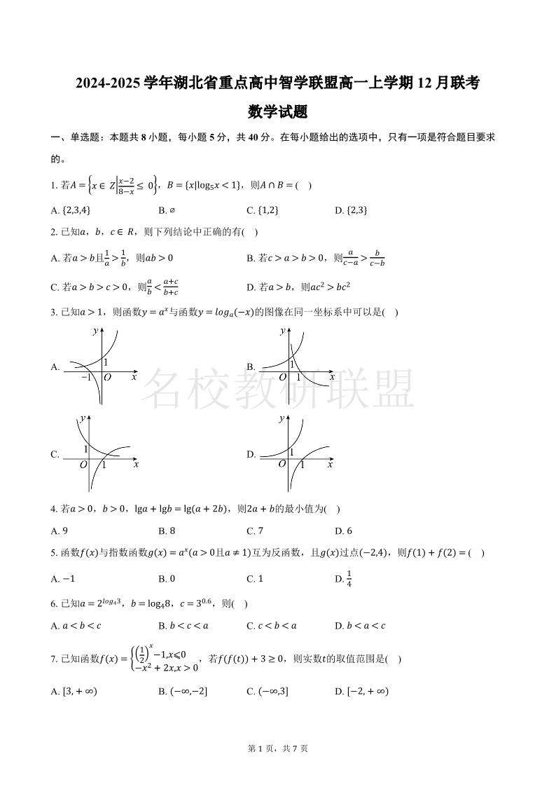 湖北省重点高中智学联盟2024年秋季高一年级12月联考 数学.pdf