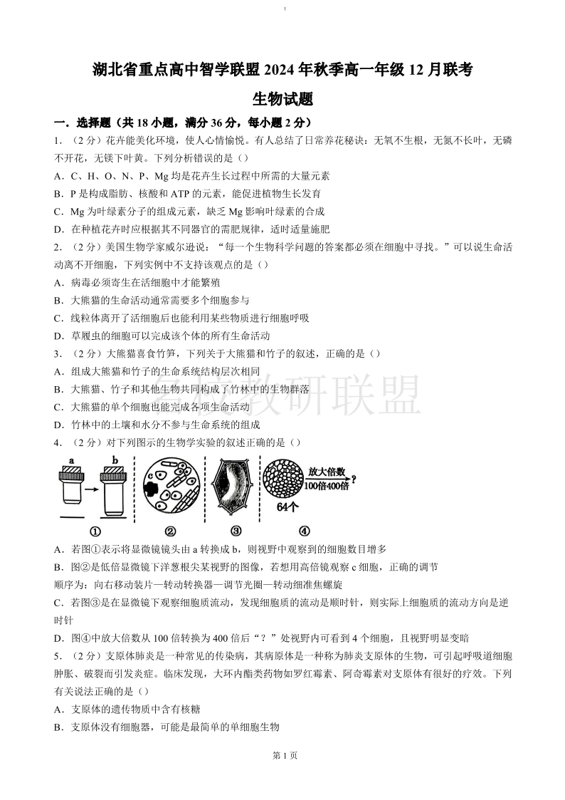 湖北省重点高中智学联盟2024年秋季高一年级12月联考 生物.pdf