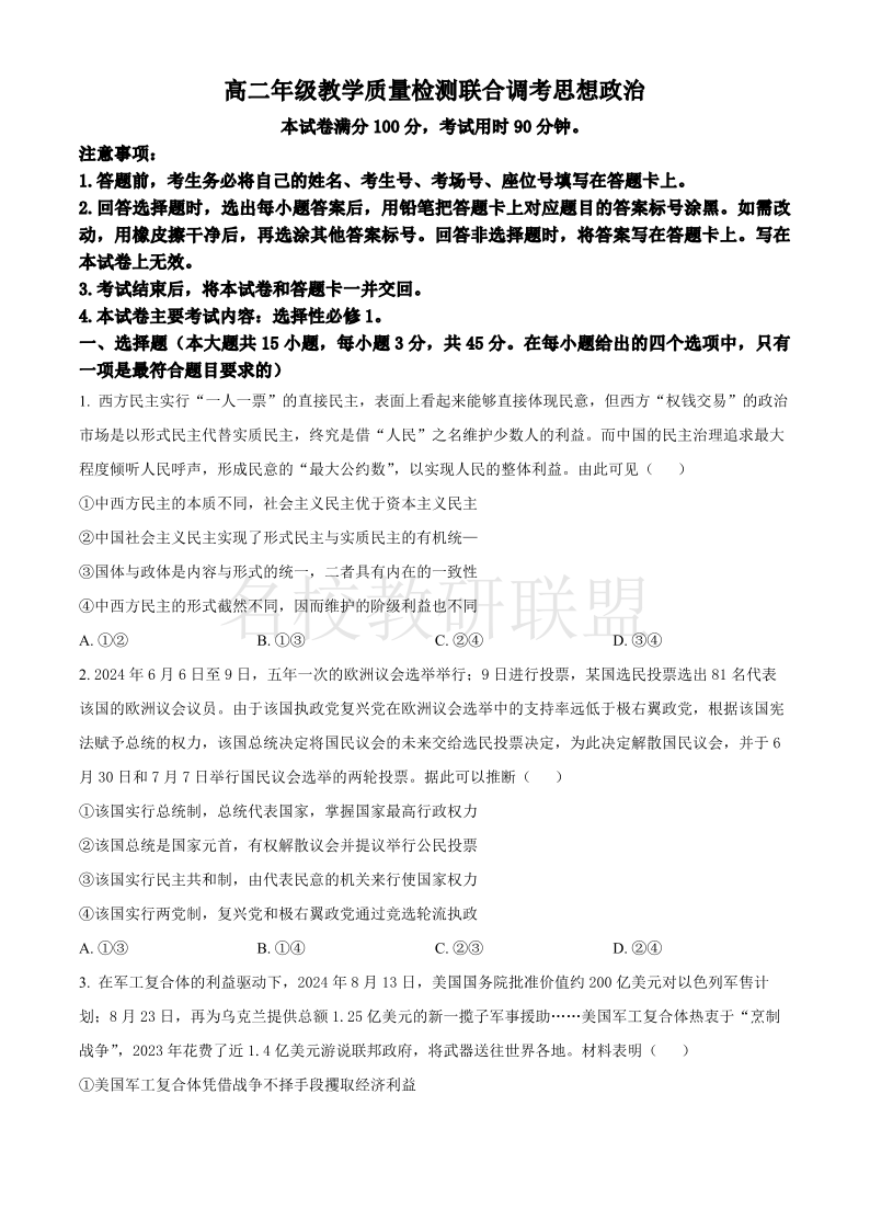 山东省大联考2024-2025学年高二上学期12月月考 政治.pdf