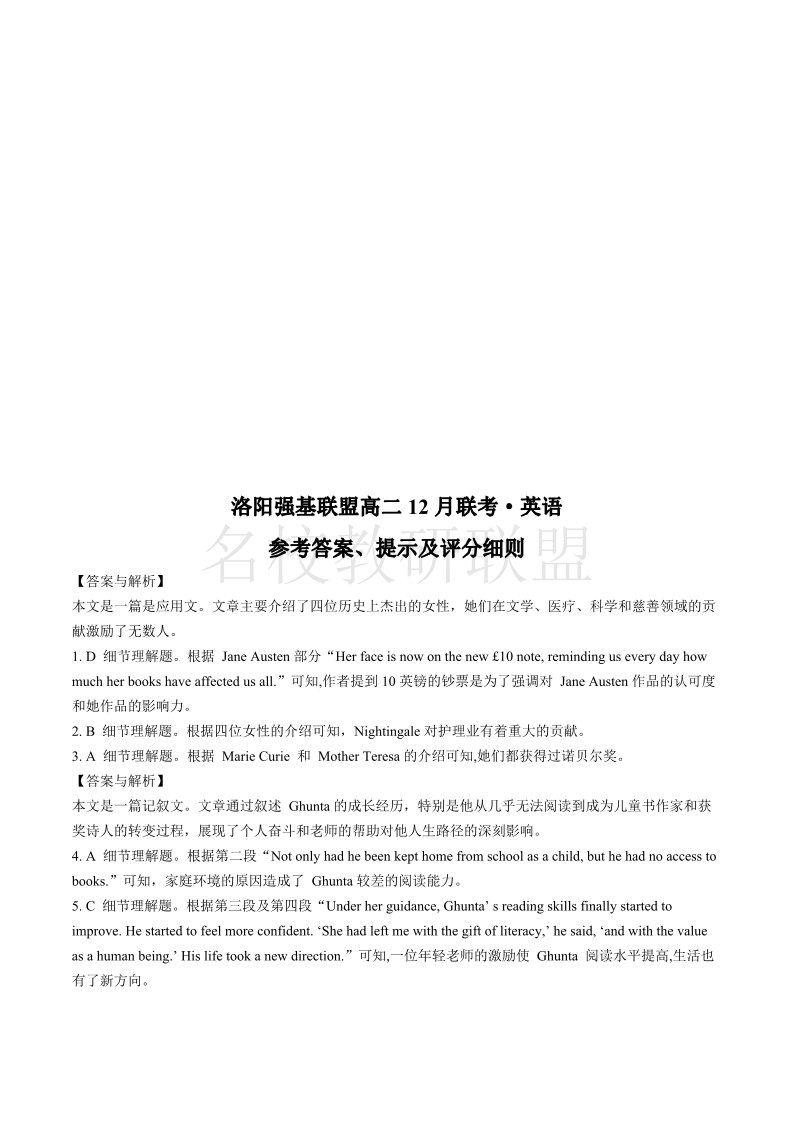 河南省洛阳市强基联盟2024-2025学年高二上学期12月月考 英语答案.pdf