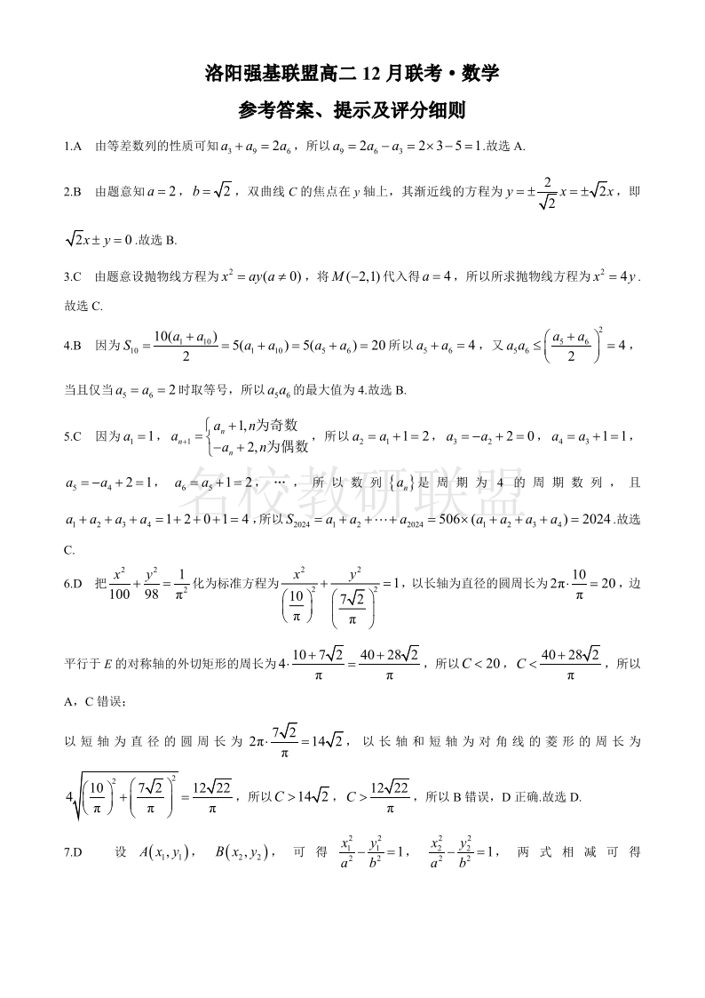 河南省洛阳市强基联盟2024-2025学年高二上学期12月月考 数学答案.pdf