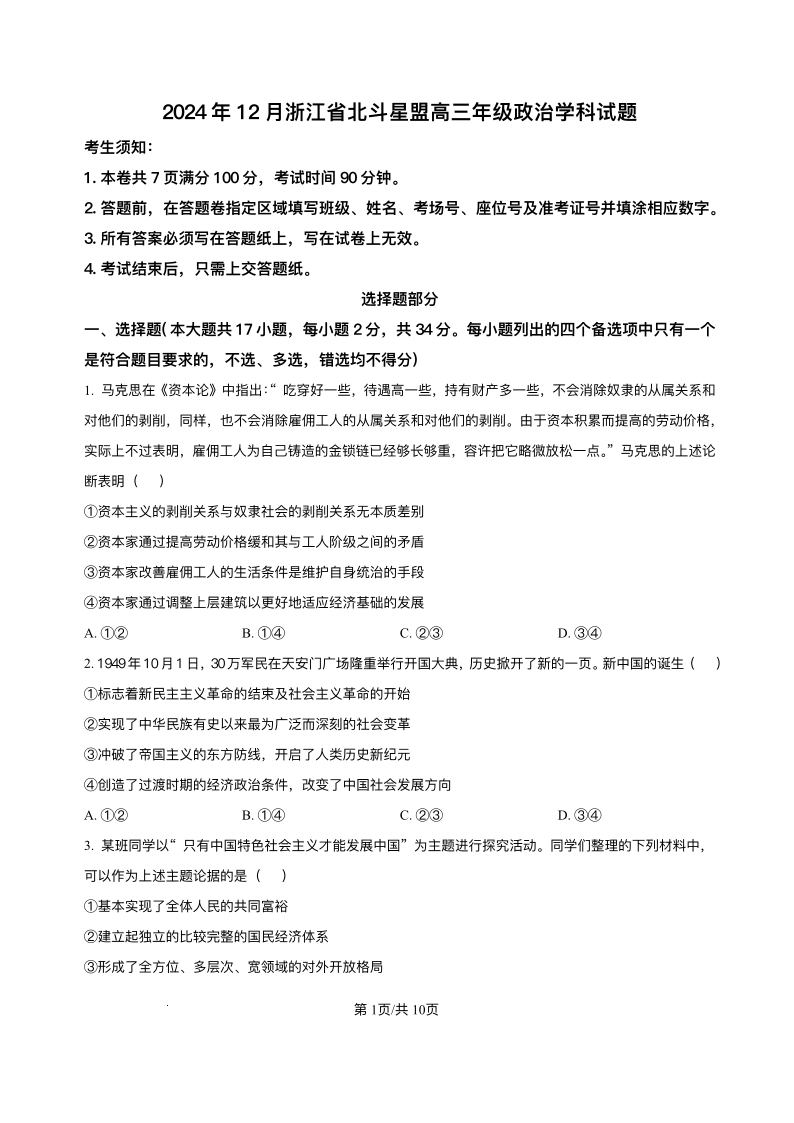 浙江省北斗星盟2024-2025学年高三上学期12月阶段性联考 政治.pdf