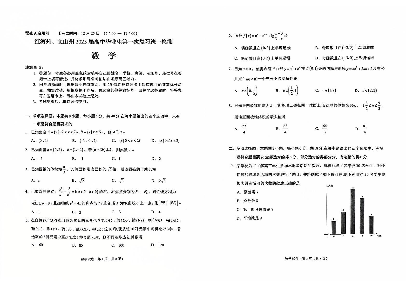 红河州、文山州2025届高中毕业生第一次复习统一检测 数学.pdf