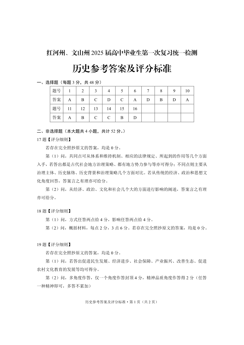 红河州、文山州2025届高中毕业生第一次复习统一检测 历史答案.pdf