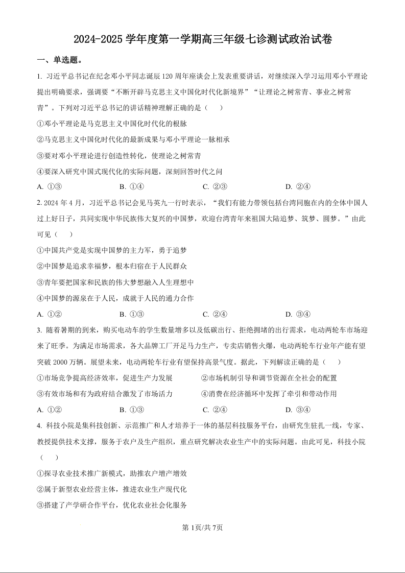 内蒙古自治区巴彦淖尔市第一中学2025届高三上学期第七次诊断 政治.docx