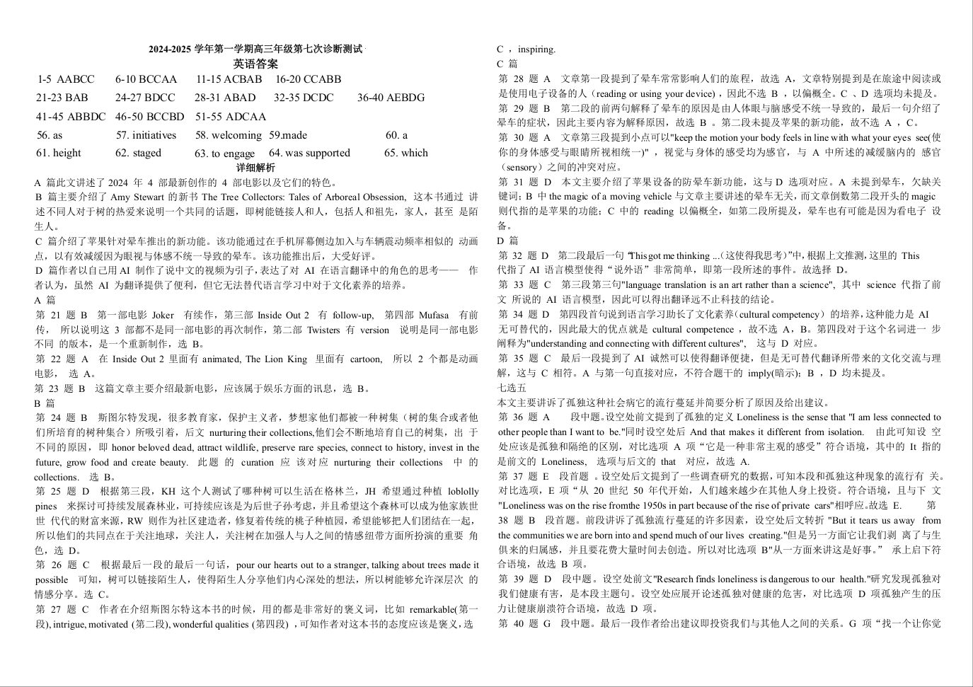 内蒙古自治区巴彦淖尔市第一中学2025届高三上学期第七次诊断 英语答案.docx