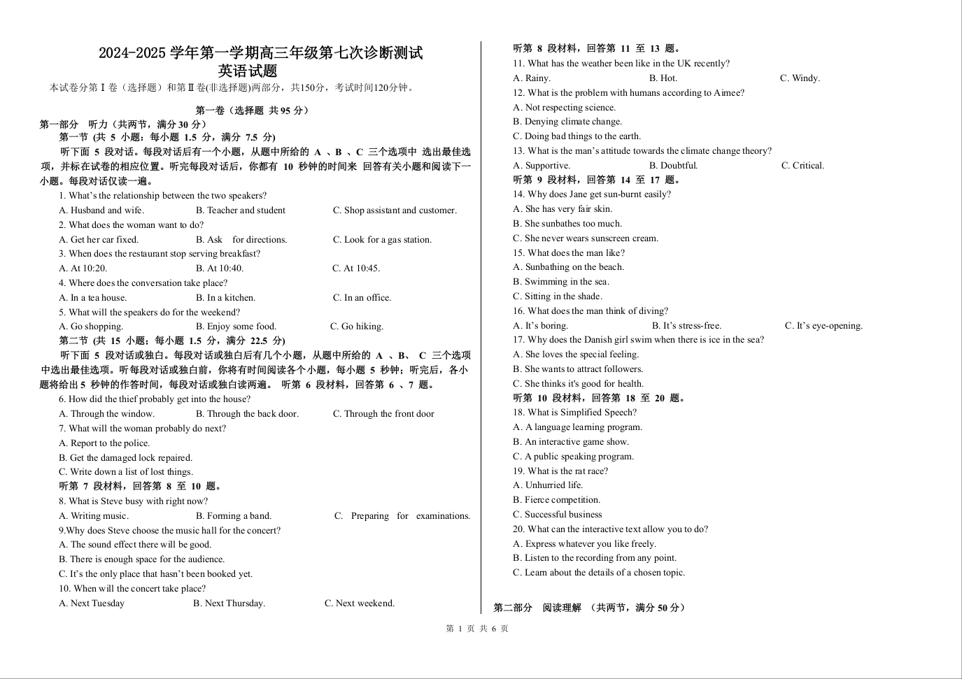 内蒙古自治区巴彦淖尔市第一中学2025届高三上学期第七次诊断 英语.docx