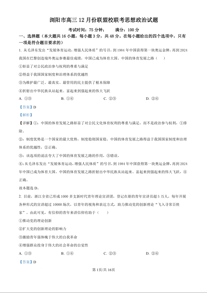 湖南省浏阳市联盟校2025届高三上学期12月联考 政治答案.docx