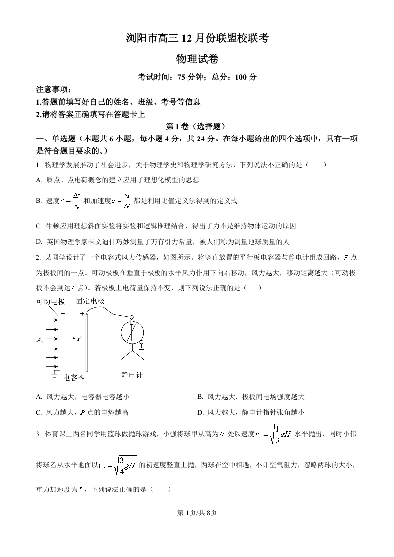 湖南省浏阳市联盟校2025届高三上学期12月联考 物理.docx