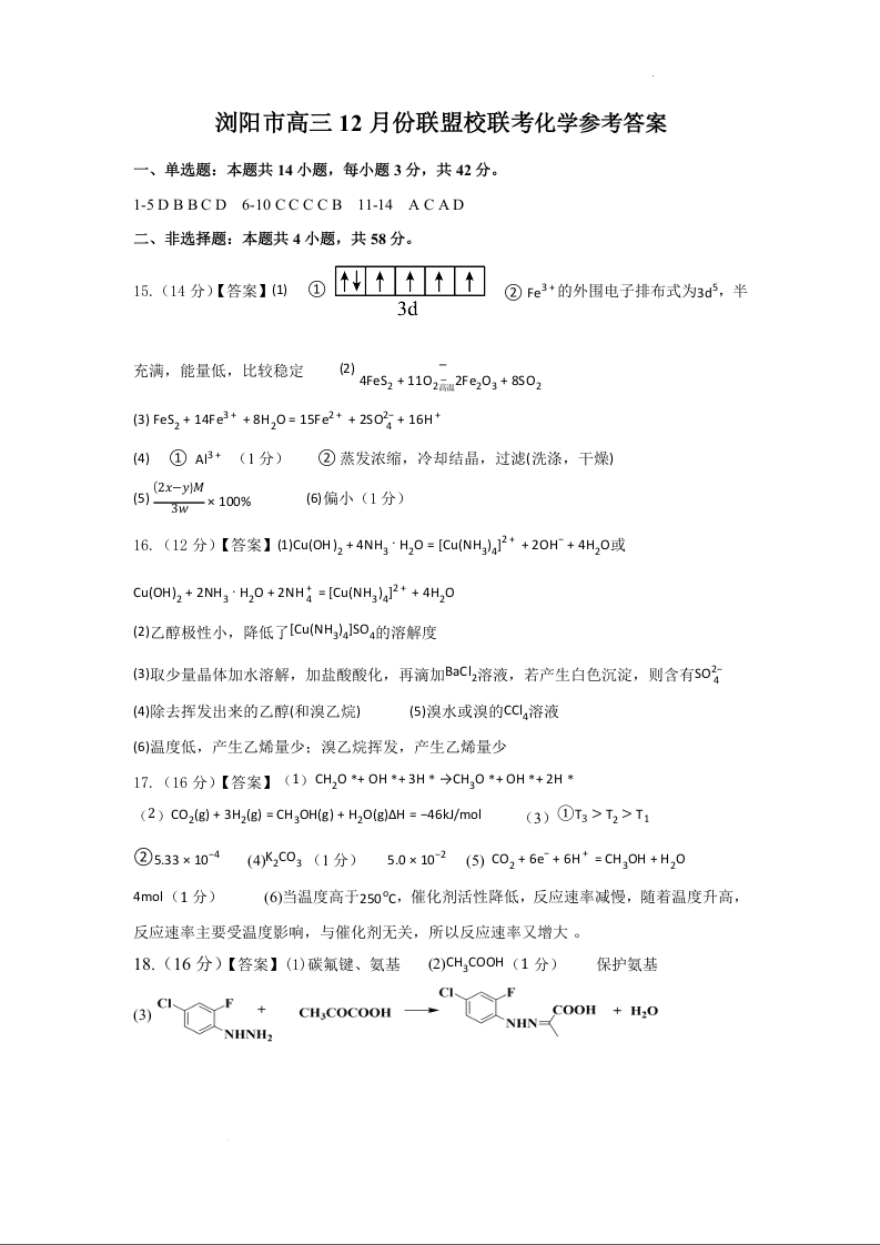 湖南省浏阳市联盟校2025届高三上学期12月联考 化学答案.docx