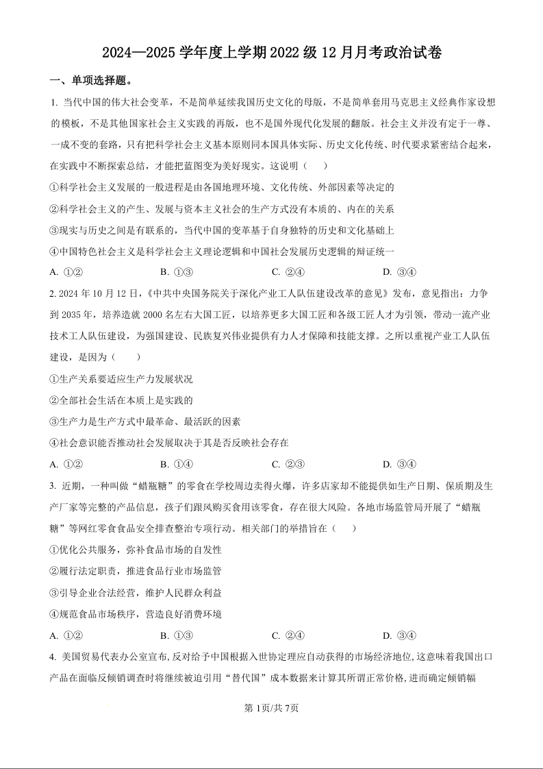 湖北省荆州市沙市中学2025届高三上学期12月月考 政治.docx