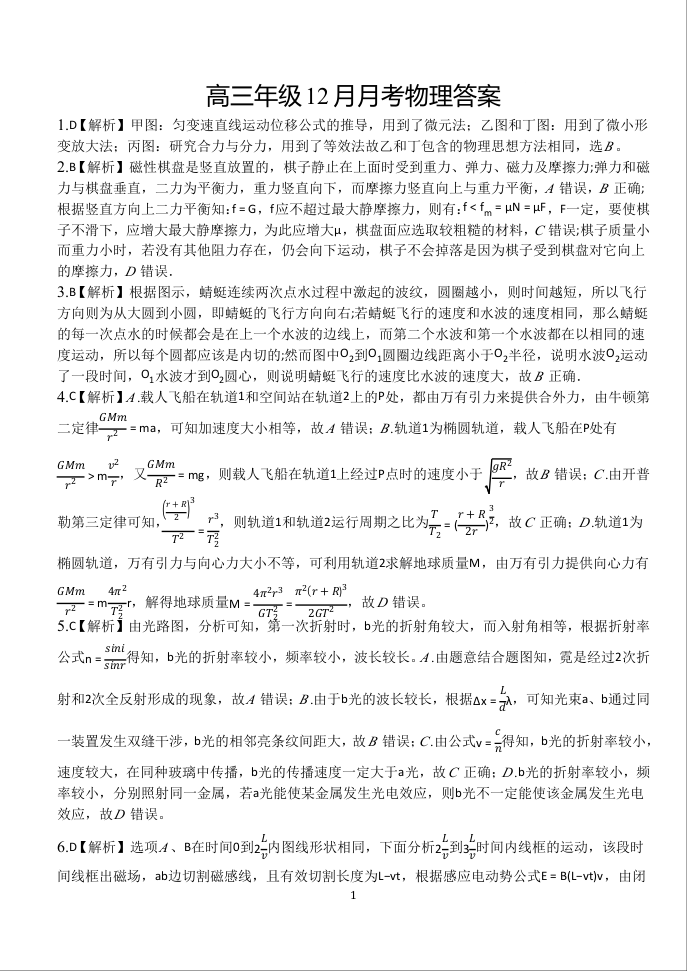 湖北省荆州市沙市中学2025届高三上学期12月月考 物理答案.docx