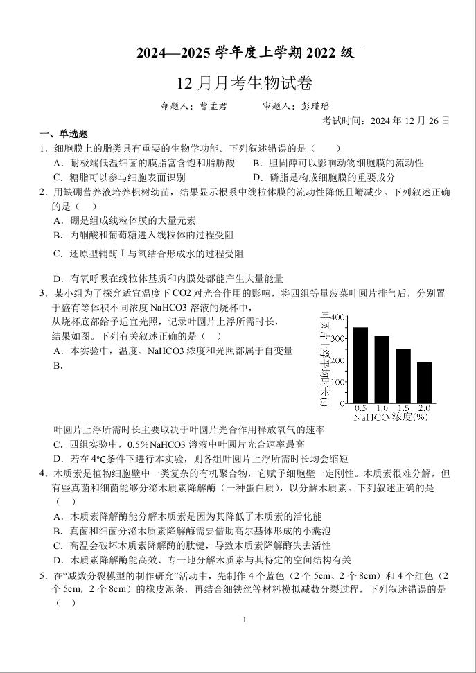 湖北省荆州市沙市中学2025届高三上学期12月月考 生物.docx