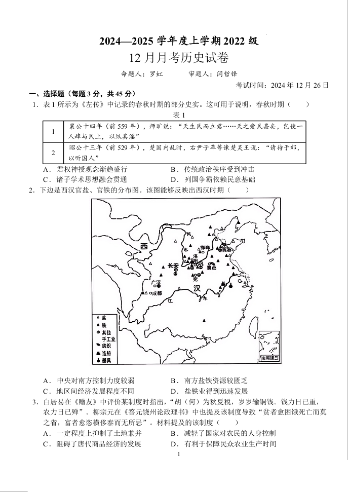 湖北省荆州市沙市中学2025届高三上学期12月月考 历史.docx