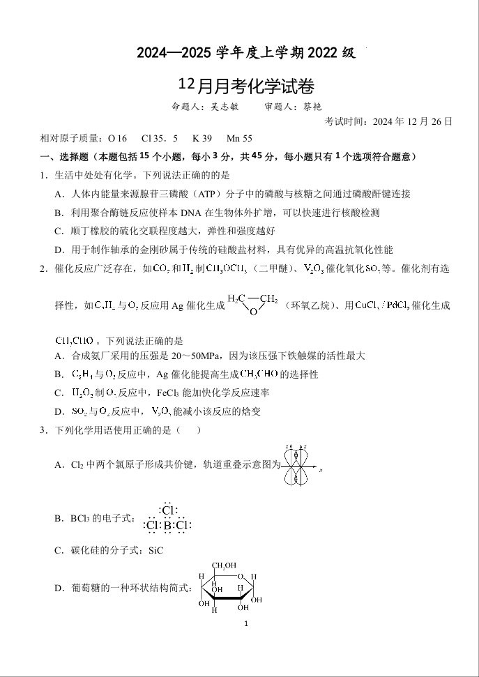 湖北省荆州市沙市中学2025届高三上学期12月月考 化学.docx
