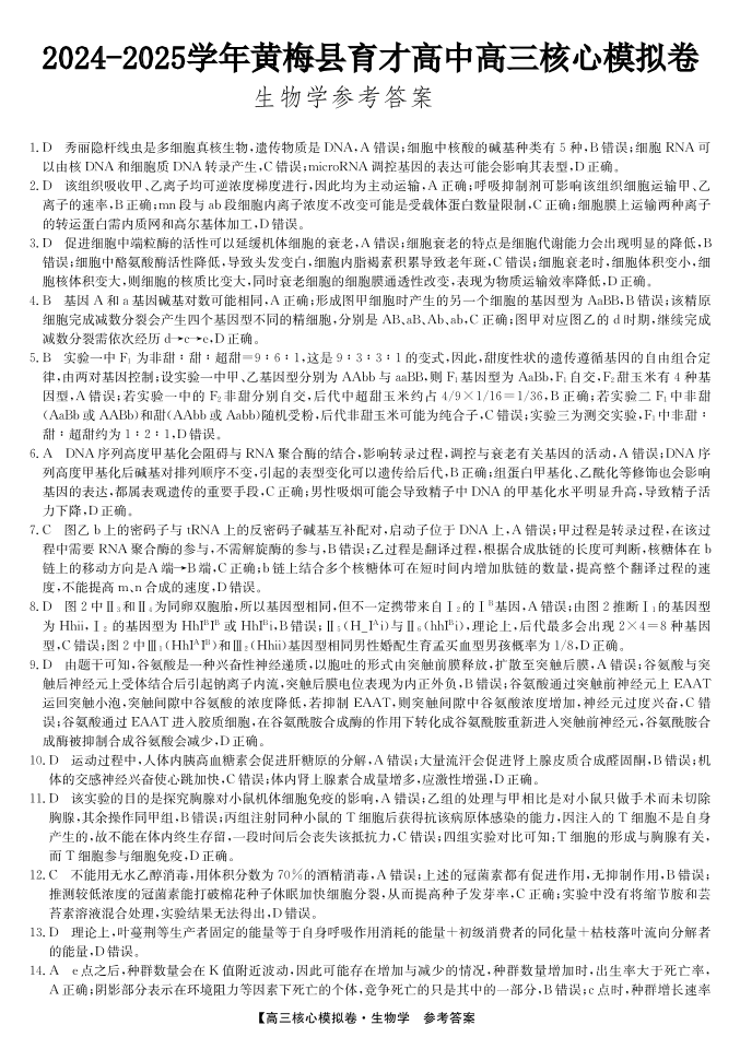 湖北省黄梅县育才高级中学2025届高三核心模拟预测 生物答案.pdf
