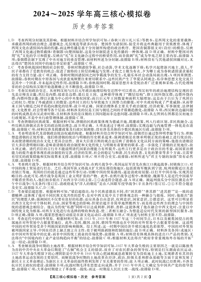 湖北省黄梅县育才高级中学2025届高三核心模拟预测 历史答案.pdf
