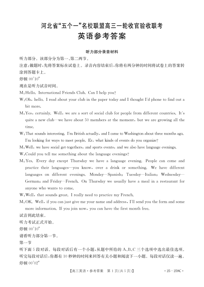 河北省“五个一”名校联盟2024-2025学年高三上学期12月月考 英语答案.pdf