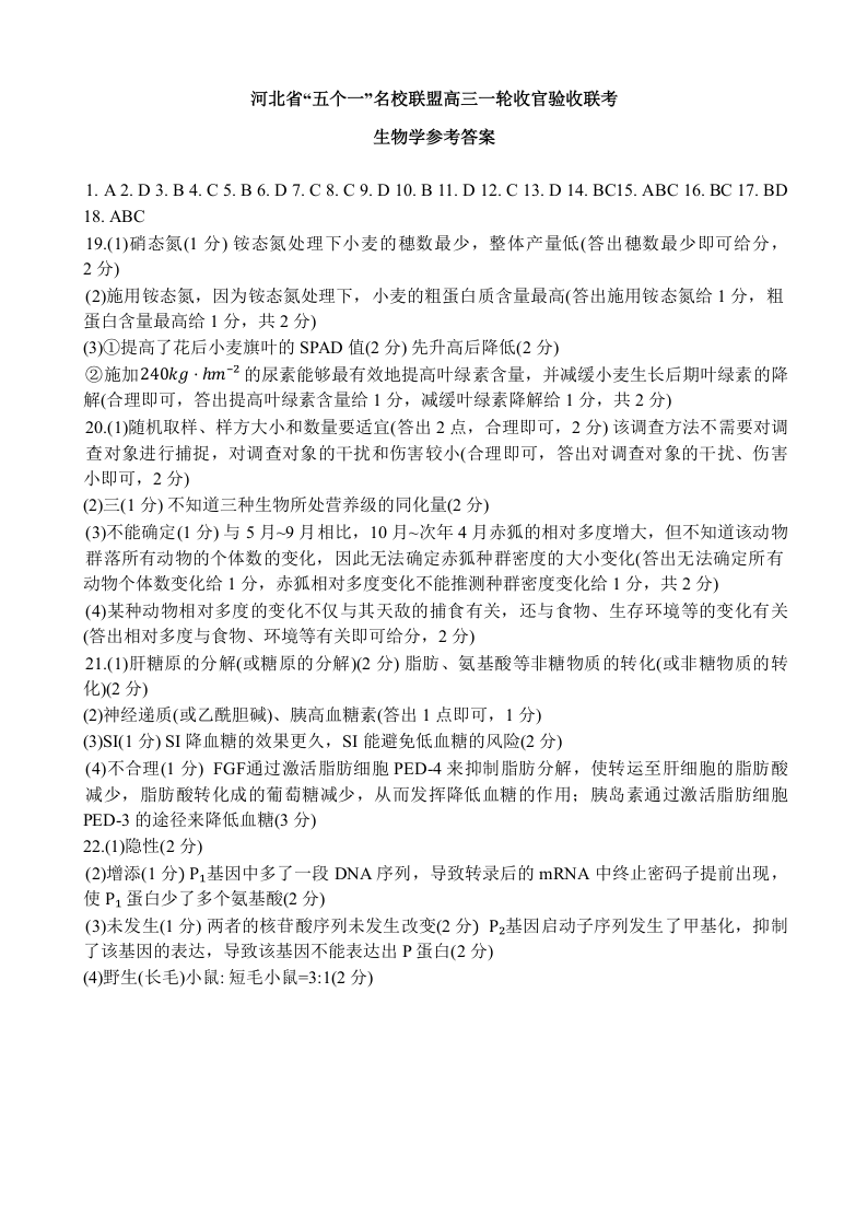 河北省“五个一”名校联盟2024-2025学年高三上学期12月月考 生物答案.docx