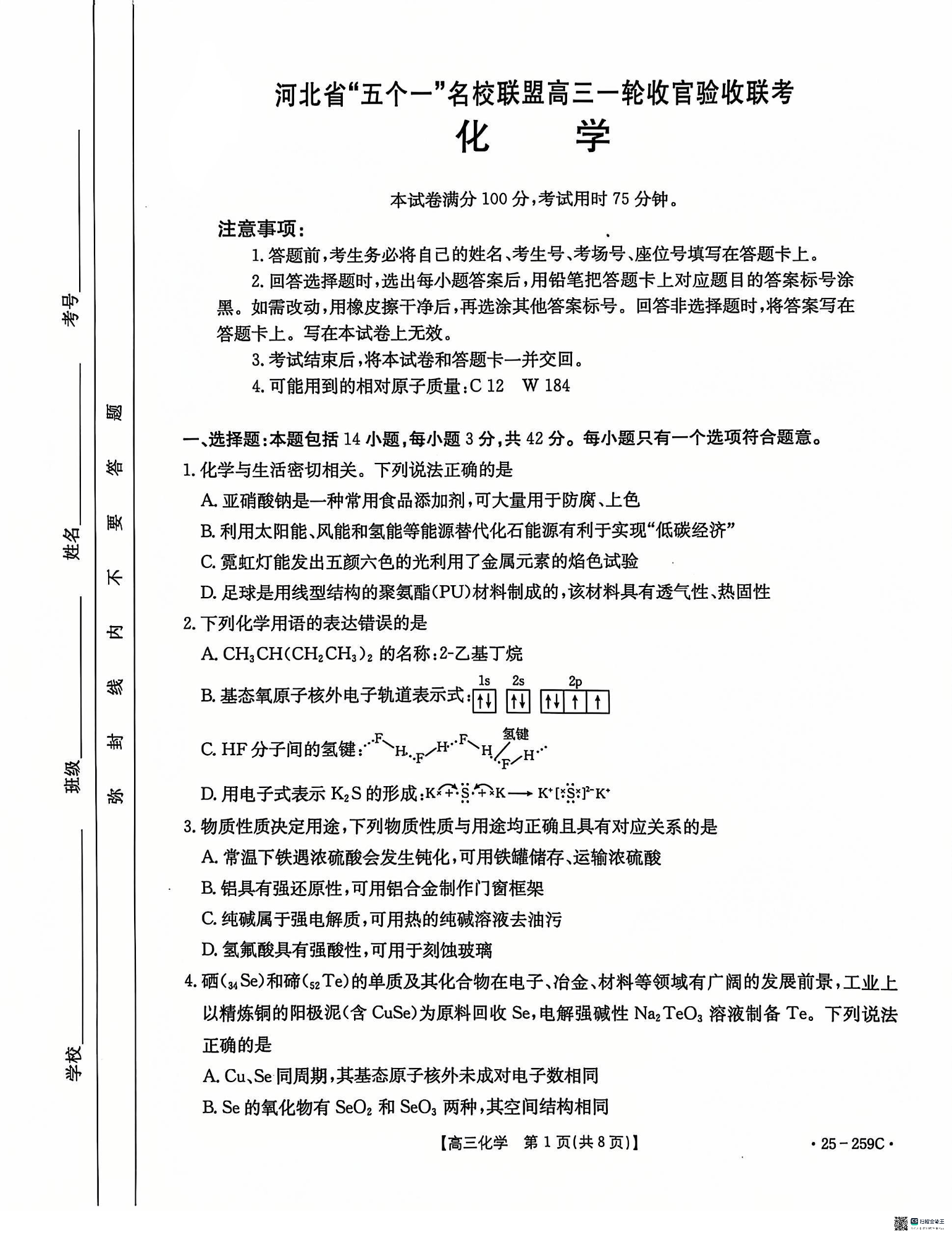 河北省“五个一”名校联盟2024-2025学年高三上学期12月月考 化学.pdf
