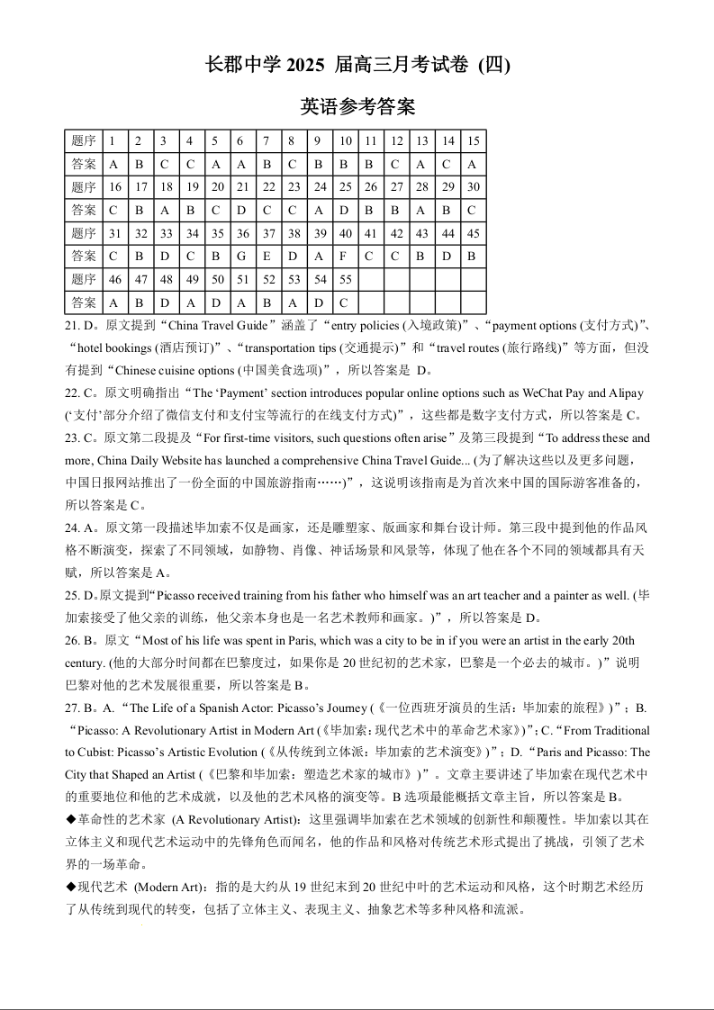 湖南省长沙市长郡中学2025届高三上学期月考(四)英语答案.docx