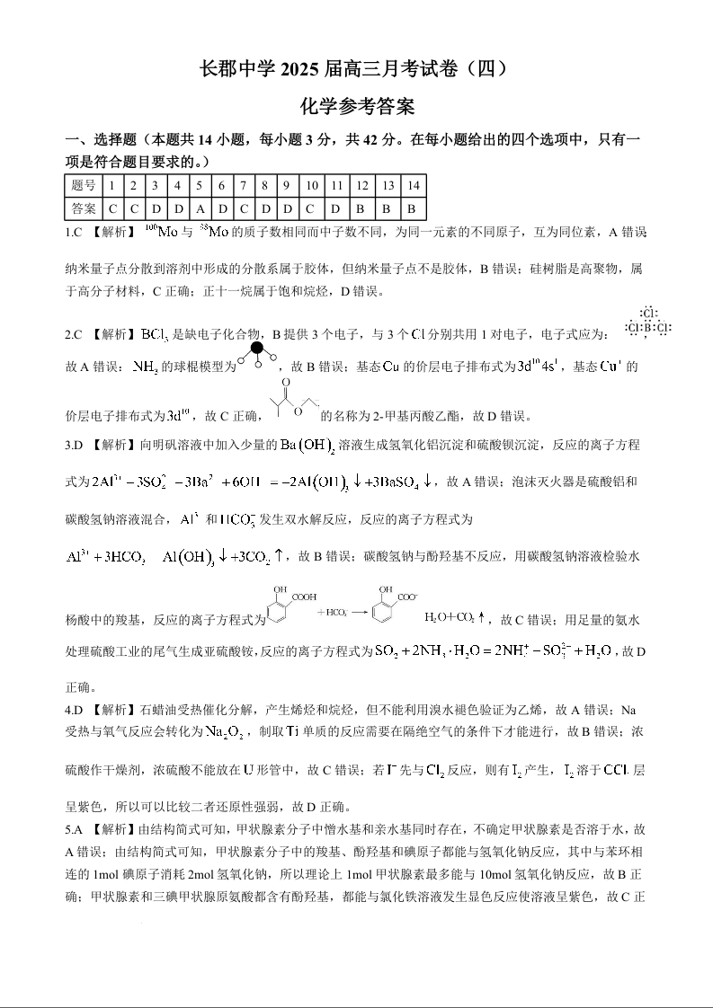 湖南省长沙市长郡中学2025届高三上学期月考(四)化学答案.docx
