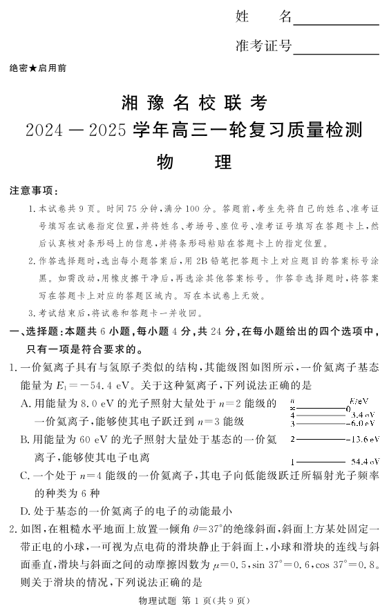 湘豫名校联考2024-2025学年高三上学期12月一轮复习质量检测 物理.pdf