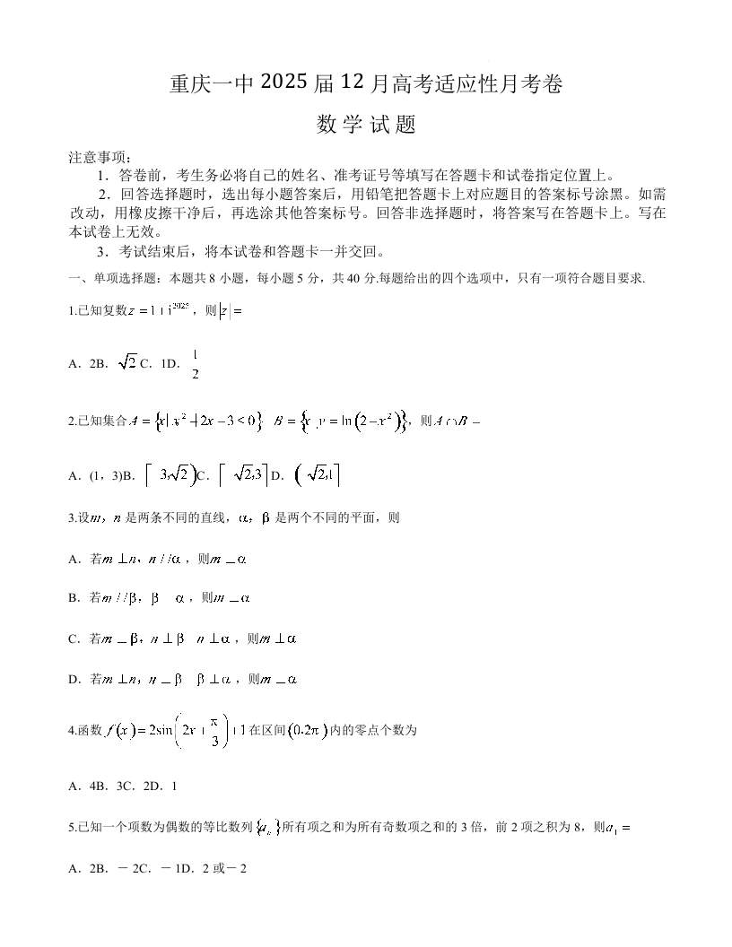 重庆市第一中学校2025届高三上学期12月月考 数学.docx