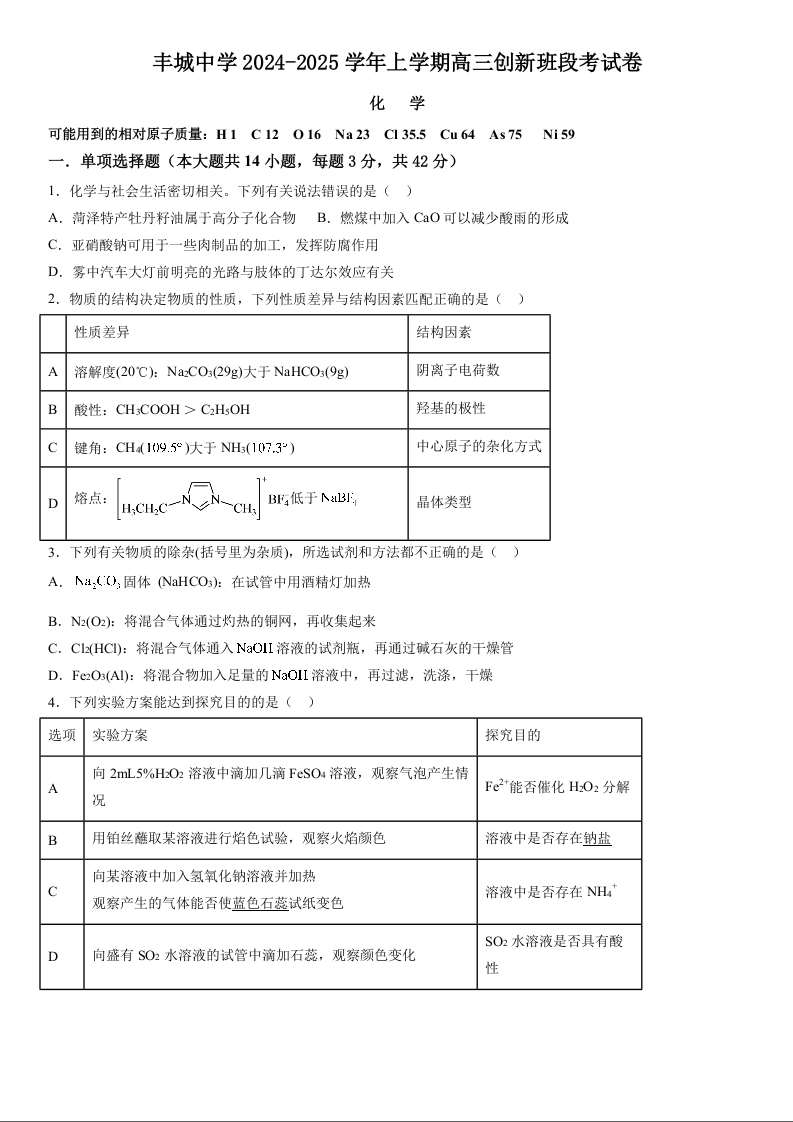 江西省宜春市丰城中学2024-2025学年高三创新班上学期12月段考 化学.docx