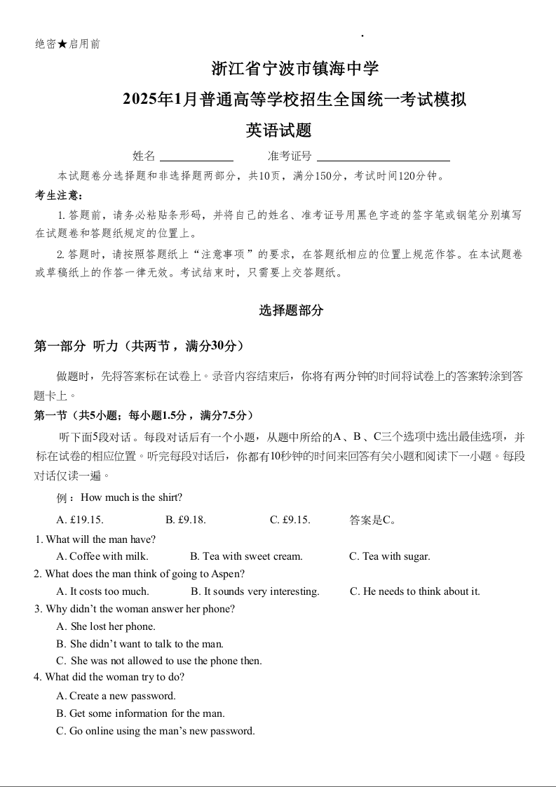 浙江省宁波镇海中学2025届高三1月首考模拟最后一卷 英语.docx