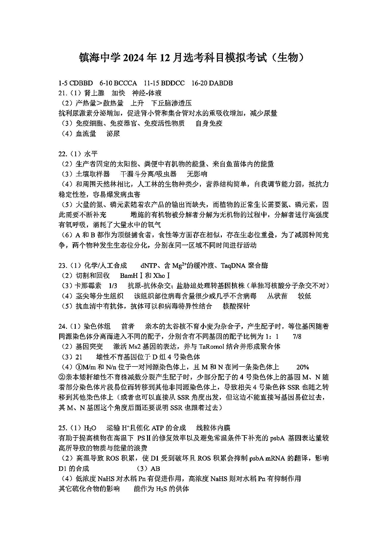 浙江省宁波镇海中学2025届高三1月首考模拟最后一卷 生物答案.pdf