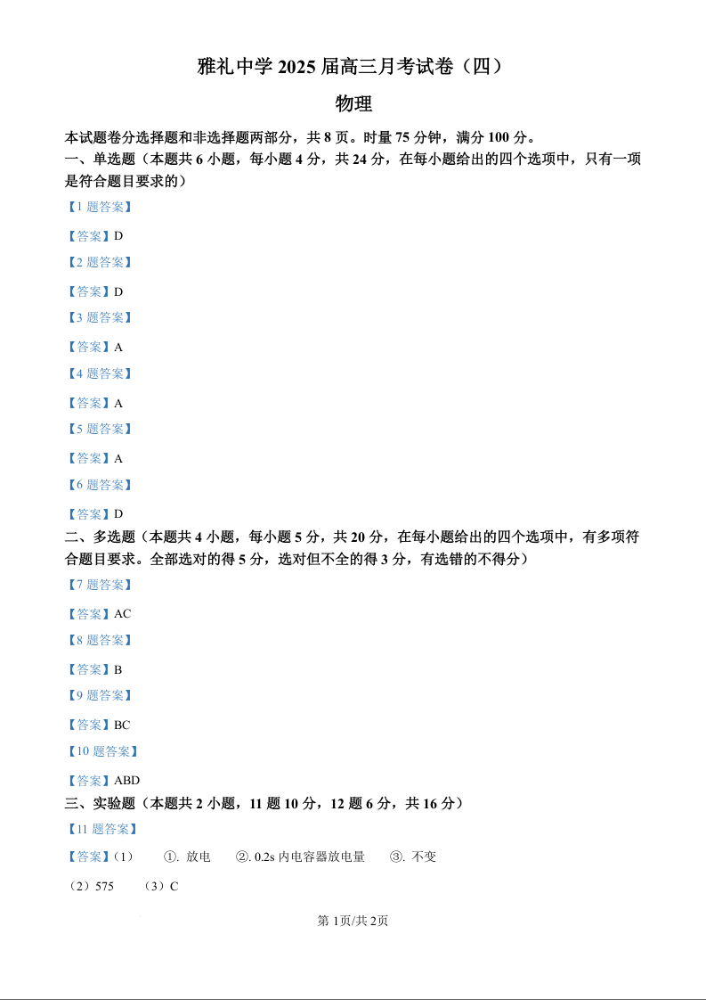 湖南省长沙市雅礼中学2025届高三上学期月考(四)物理答案.docx