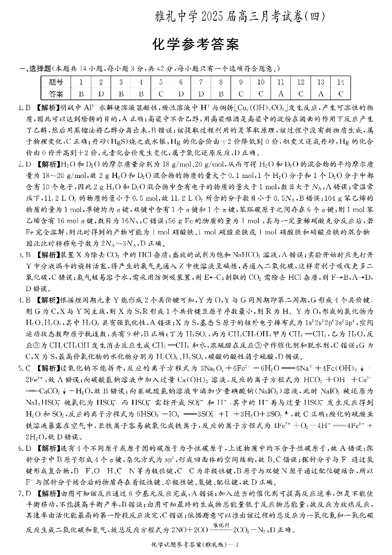 湖南省长沙市雅礼中学2025届高三上学期月考(四)化学答案.pdf