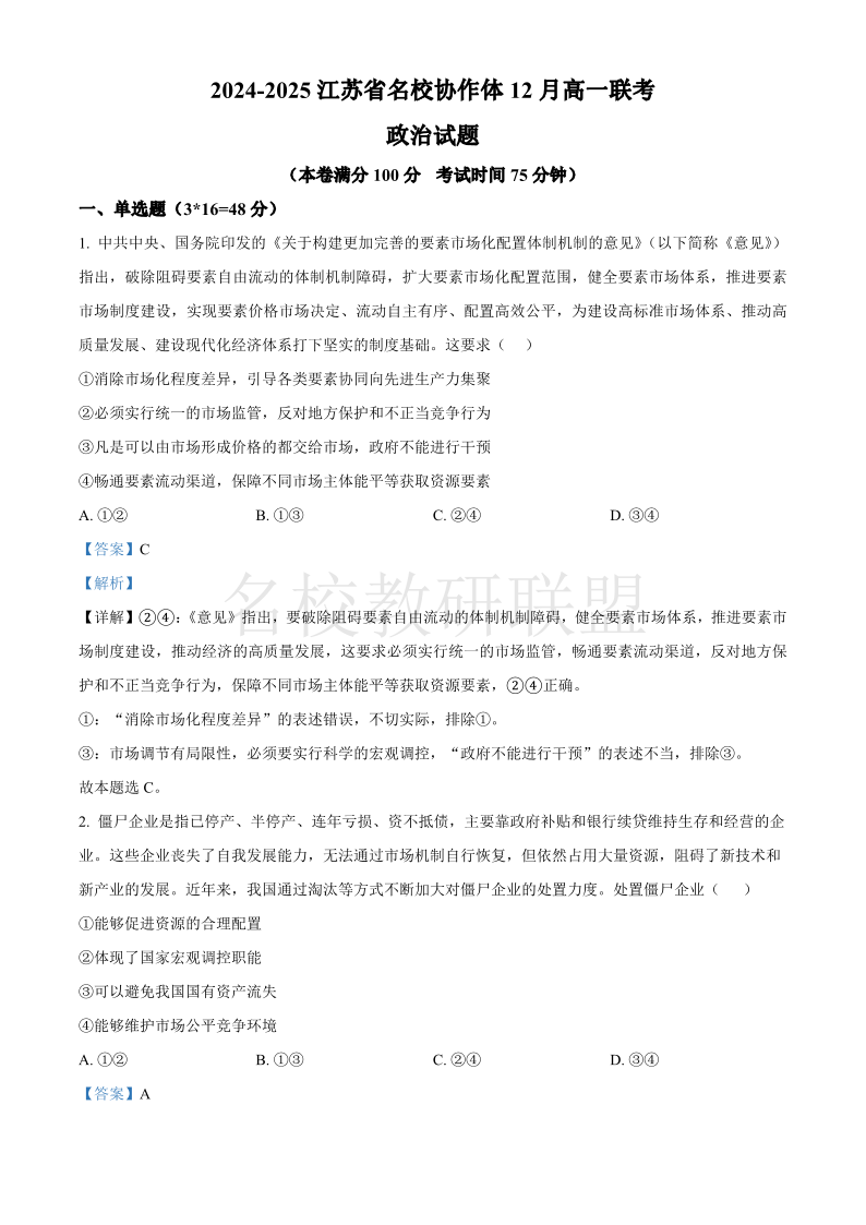 江苏省名校协作体2024-2025学年高一上学期12月联考 政治答案.pdf