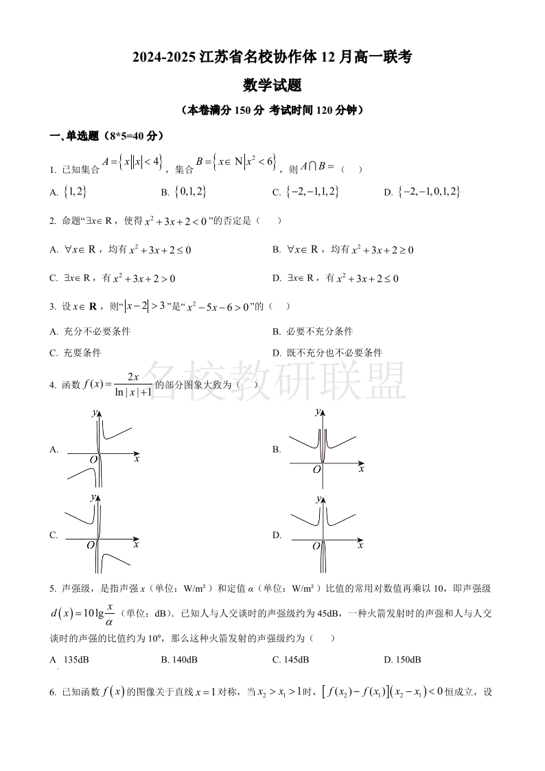 江苏省名校协作体2024-2025学年高一上学期12月联考 数学.pdf