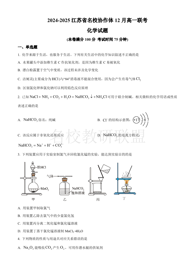 江苏省名校协作体2024-2025学年高一上学期12月联考 化学.pdf