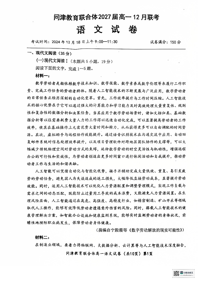 湖北省武汉市问津教育联合体2024-2025学年高一上学期12月月考 语文.pdf