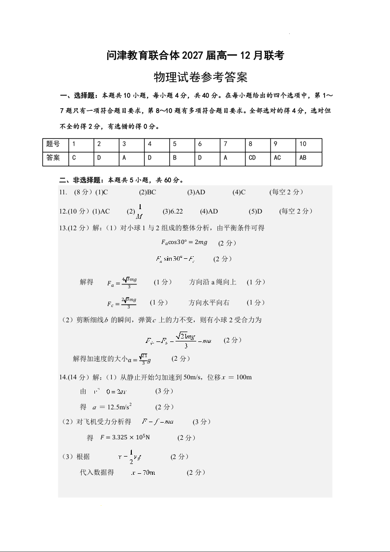 湖北省武汉市问津教育联合体2024-2025学年高一上学期12月月考 物理答案.docx
