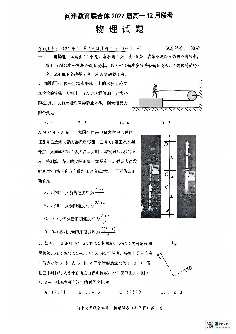 湖北省武汉市问津教育联合体2024-2025学年高一上学期12月月考 物理.pdf
