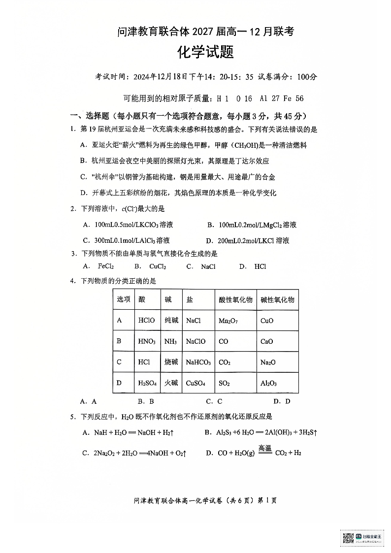 湖北省武汉市问津教育联合体2024-2025学年高一上学期12月月考 化学.pdf