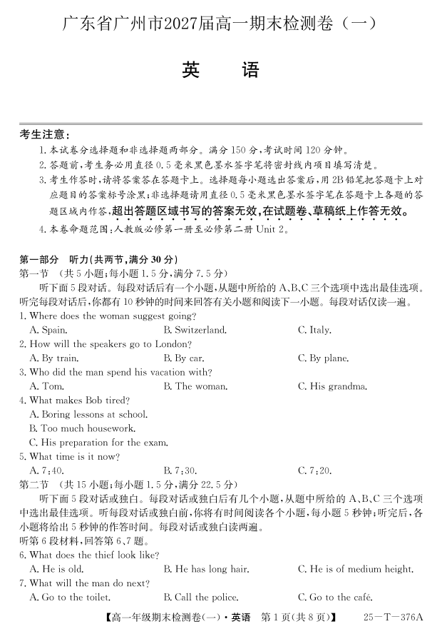 广东省广州市2024-2025学年高一上学期期末检测卷(一)英语.pdf
